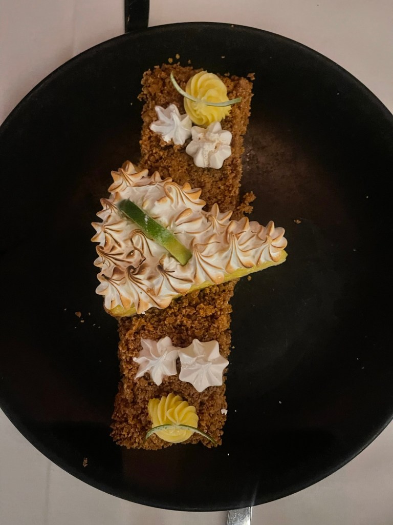 The key lime pie was decent. more gelatinous than i expected but the meringue on top was really good. While i did think the breadcrumb on the side was fun and different it kind of was weird and didn’t really add to the eating experience imo like it was cool you could as much graham to your key lime pie bite as you want but it was honestly a bit annoying.