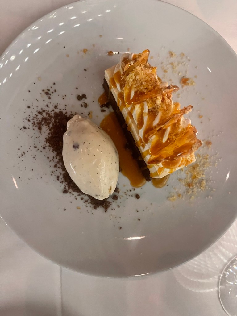 They really surprised me with that chocolate mousse. The crumble/brittle thing on top was p good slightly annoying as an add on on the dish Idk I def like it wasn’t easy or intuitive to get a bite with all ingredients I just prefer when the presentation is nice and the “bites” are intuitive/easy. I did like it a lot despite the logistical “nightmare”. The presentation was also cute and i liked how it came out